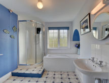 4 -sobna obiteljska kuća na 2 etaže. Prostrano i svijetlo, komforno i ukusno uređena: otvoreni dnevni boravak s TV-om, plosnatim TV ekranom i DVD-om. Otvorena kuhinja (4 ploče za kuhanje, pećnica, mikrovalna pećnica, zamrzivač) s stolom za blagovanje. Kada/tuš/WC. Grijanje. Gornji kat: 1 bračna soba s 1 bračnim krevetom i TV-om (plosnatim TV ekranom). 2 sobe, svaka soba s 2 kreveta. Tuš/WC. Grijanje. Garnitura za sjedenje, vrtni roštilj. Lijep pogled na krajolik. Na raspolaganju: perilica za rublje, sušilica. Internet (wireless LAN [WLAN], besplatan). Blu-ray player, iPod docking station. Dodatna informacija: kuća za nepušače. 2 kućna ljubimca / psa dozvoljena.- postrojenja