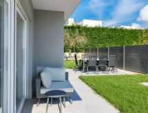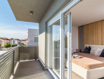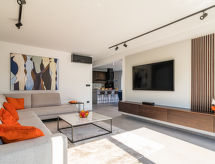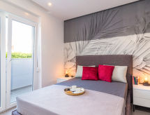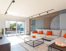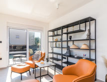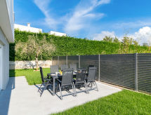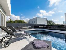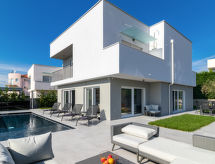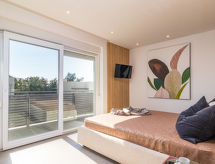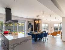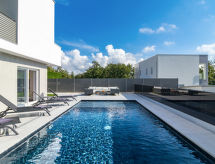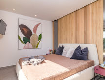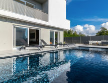 4 -sobna vila 160 m2 na 2 etaže, prema jugozapadu. Lijepo i ukusno uređena: dnevni boravak/blagovaona 80 m2 s kabelskom TV i međunarodnim TV kanalima (plosnatim TV ekranom), klima uređajem. Izlaz na terasu, na bazen. Otvorena kuhinja (pećnica, perilica za suđe, 4 Indukcione ploče, toster, kuhalo za vodu, mikrovalna pećnica, zamrzivač, el. aparat za kavu, kuhinjski otok). Odv. WC. Gornji kat: 2 sobe 15 m2, svaka soba s 1 franc. krevetom (180 cm, dužina 200 cm), tušem/WC-om i TV-om (plosnatim TV ekranom), klima uređajem. Izlaz na balkon. 1 soba 15 m2 s 1 franc. krevetom (140 cm, dužina 190 cm), tušem/WC-om i klima uređajem. Izlaz na balkon. Podno grijanje, grijanje toplim zrakom. 3 balkona 6 m2, terasa 16 m2 (djelomično natkrita). Garnitura za sjedenje, ležaljke, ostava. Lijep pogled na more i krajolik. Na raspolaganju: sef, glačalo, visoka dječja stolica, dječji krevetić. Internet (wireless LAN [WLAN], besplatan). Dodatna informacija: kuća za nepušače. Vatrogasni aparat. Na raspolaganju: playstation (uključeno u cijenu).- postrojenja