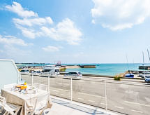 3 -sobni apartman 74 m2, u povišenom prizemlju. Objekt pogodan za 4 odraslih + 2 djece. Udobno uređen: predsoblje. Dnevni boravak/blagovaona s 1 kaučem za 2 osobe i TV-om (plosnatim TV ekranom). Izlaz na terasu. 1 soba s 2 kreveta (90 cm, dužina 190 cm). 1 soba s 1 x 2 kreveta na kat. Izlaz na balkon. Kuhinja (4 ploče za kuhanje, pećnica, perilica za suđe, mikrovalna pećnica, zamrzivač, el. aparat za kavu). Izlaz na balkon. Tuš, odv. WC. El. grijanje. Mali balkon 7 m2, velika terasa 24 m2. Garnitura za sjedenje, ležaljke (2). Pogled na more i luku. Na raspolaganju: perilica za rublje. Internet (wireless LAN [WLAN], uz doplatu). Parking br. 1. Dodatna informacija: apartman prema cesti. Protupožarni alarm.- Značajke smještaja