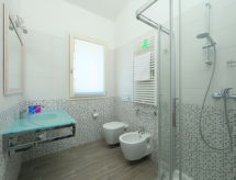 4 -sobna kuća u nizu 100 m2 na 2 etaže. Komforno i lijepo uređena: predsoblje s TV-om sa sat. prijemnikom (plosnatim TV ekranom). 2 bračne sobe. Tuš/bidet/WC. Klima uređaj. Gornji kat: (kružne stepenice) dnevni boravak/blagovaona s TV-om (plosnatim TV ekranom). Izlaz na mjesto za sjedenje u vrtu. 1 bračna soba. Kuhinjska niša (4 ploče za kuhanje, pećnica, perilica za suđe, zamrzivač). Tuš/bidet/WC. Vrt 40 m2. Djelomičan pogled na more. Na raspolaganju: perilica za rublje. Internet (wireless LAN [WLAN], uz doplatu). Parking uz kuću. 1 kućni ljubimac / pas dozvoljen.- postrojenja