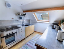 4 -sobna seoska kuća na 1. katu. Prostrano i svijetlo, komforno i ukusno uređena: otvoreni dnevni boravak/blagovaona s stolom za blagovanje, TV-om, plosnatim TV ekranom i DVD-om. 1 bračna soba s 1 bračnim krevetom. 1 bračna soba s kosim stropom s 1 bračnim krevetom. 1 soba s kosim stropom s 2 kreveta. 1 bračna soba s kosim stropom s 1 krevetom i 1 bračnim krevetom s odv. WC-om. Otvorena kuhinja (4 ploče za kuhanje, pećnica, perilica za suđe, mikrovalna pećnica, zamrzivač). Tuš/WC. Grijanje. Garnitura za sjedenje. Na raspolaganju: perilica za rublje, sušilica. Internet (wireless LAN [WLAN], besplatan). Dodatna informacija: kuća za nepušače.- postrojenja