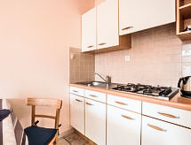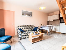 1 -sobni studio 43 m2 na 2 etaže, u prizemlju. Lijepo uređen: dnevni boravak/blagovaona s TV-om (plosnatim TV ekranom). Otvorena kuhinja (4 ploče za kuhanje, pećnica, el. aparat za kavu). Gornji kat: s kosim stropom, otvorena galerija s 2 kreveta (90 cm, dužina 190 cm). Tuš/WC. Mala vrtna terasa 8 m2. Garnitura za sjedenje, ležaljke (2). Na raspolaganju: perilica za rublje. Internet (wireless LAN [WLAN], besplatan). Parking uz kuću. Dodatna informacija: najviše 2 kućna ljubimca / psa dozvoljena. Protupožarni alarm.- postrojenja