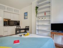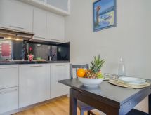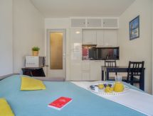 1 -sobni studio 19 m2 na 1. katu. Jednostavno uređen: dnevni boravak/blagovaona s 1 kaučem za 2 osobe (140 cm, dužina 190 cm), TV-om (plosnatim TV ekranom), ventilatorom. Kuhinjska niša (2 Indukcione ploče, toster, mikrovalna pećnica, el. aparat za kavu). Tuš/WC. Na raspolaganju: Internet (wireless LAN [WLAN], uz doplatu). Dodatna informacija: apartman za nepušače. Protupožarni alarm. 641220019144E- Značajke smještaja
