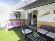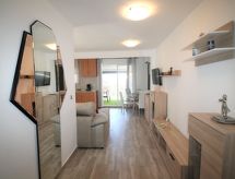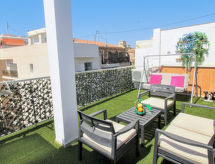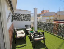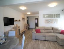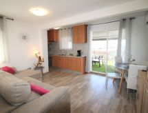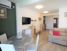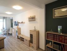 "Benidorm Center", 3 -sobni apartman 63 m2. Objekt pogodan za 3 odraslih. Prostrano i svijetlo, renoviran godine 2021, jednostavno i svrsishodno uređen: dnevni boravak/blagovaona 23 m2 s digitalnim TV i klima uređajem. Izlaz na terasu. 1 soba 9 m2 s 1 franc. krevetom (150 cm, dužina 190 cm), digitalnim TV. 1 soba 7 m2 s 1 krevetom (120 cm, dužina 190 cm), digitalnim TV. Kuhinjska niša (pećnica, 3 staklokeramičke ploče za kuhanje, toster, kuhalo za vodu, mikrovalna pećnica, zamrzivač, el. aparat za kavu). Tuš/WC. Klima uređaj. Velika terasa 18 m2. Garnitura za sjedenje. Pogled u daljini na more i mjesto. Na raspolaganju: perilica za rublje, glačalo, visoka dječja stolica, dječji krevetić do 2 godine, sušilo za kosu. Internet (wireless LAN [WLAN], besplatan). 1 mali kućni ljubimac / pas dozvoljen. VT323808BM- postrojenja