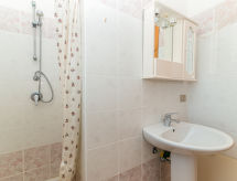 3 -sobni apartman 65 m2 na 1. katu. Jednostavno i svrsishodno uređen: dnevni boravak/blagovaona s 1 kaučem za 2 osobe i TV-om. 1 bračna soba. 1 soba s 2 kreveta. Kuhinjska niša (4 ploče za kuhanje, zamrzivač). Izlaz na balkon. Tuš/bidet/WC. Garnitura za sjedenje.- postrojenja