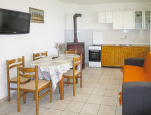 4 -sobna kuća 75 m2. Dnevni boravak/blagovaona s 1 kaučem za 1 osobu, TV-om i peći na drva. 1 soba s 1 franc. krevetom. Izlaz na terasu. 2 sobe, svaka soba s 1 franc. krevetom. Otvorena kuhinja (pećnica, 4 plamena za kuhanje, toster, kuhalo za vodu, el. aparat za kavu). Tuš/WC. Terasa 15 m2 (natkrita). Ležaljke. Pogled na more. Na raspolaganju: drvo (uklj.). Dodatna informacija: kuća za nepušače.- postrojenja