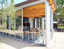 "Bungalow Trendy", 3 -sobna mobilna kućica 30 m2, u prizemlju. Objekt pogodan za 4 odraslih + 1 dijete. Vrlo svrsishodno i moderno uređena: dnevni boravak/blagovaona s kuhinjskim blokom i TV-om sa sat. prijemnikom. Izlaz na verandu. 1 bračna soba s 1 bračnim krevetom i odv. WC-om. 1 mala soba s 3 kreveta. Tuš/WC. Klima uređaj. Terasa 14 m2, vrt. Garnitura za sjedenje. Na raspolaganju: sef, sušilo za kosu. Internet (wireless LAN [WLAN], besplatan). Prikladno za obitelji.- postrojenja