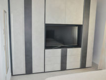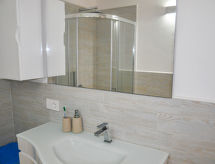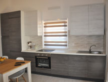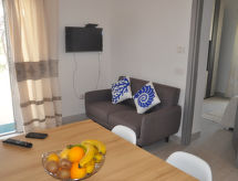 "Trilo B", 3 -sobni apartman u prizemlju. Lijepo i moderno uređen: dnevni boravak/blagovaona s stolom za blagovanje i TV-om. Izlaz na terasu. 1 bračna soba. 1 soba s 2 kreveta. Otvorena kuhinja (pećnica, perilica za suđe, 4 staklokeramičke ploče za kuhanje, toster, mikrovalna pećnica). Tuš/WC, duplim umivaonikom. El. grijanje, klima uređaj. Terasa (djelomično natkrita). Garnitura za sjedenje, vrtni roštilj, ležaljke (2). Vrlo lijep pogled na more. Na raspolaganju: perilica za rublje. Internet (wireless LAN [WLAN], besplatan). Parking (2 automobila) uz kuću. Najviše 1 kućni ljubimac / pas dozvoljen.- postrojenja