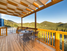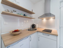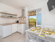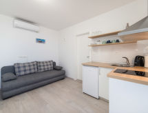 2 -sobna mobilna kućica 29 m2. Dnevni boravak/blagovaona s 1 kaučem za 2 osobe (160 cm, dužina 200 cm), TV-om sa sat. prijemnikom (plosnatim TV ekranom), klima uređajem. 1 soba s 1 franc. krevetom (160 cm, dužina 200 cm). Otvorena kuhinja (2 staklokeramičke ploče za kuhanje, zamrzivač). Tuš/WC. Grijanje toplim zrakom. Terasa 8 m2 (natkrita). Garnitura za sjedenje. Na raspolaganju: Internet (wireless LAN [WLAN], besplatan). Dodatna informacija: kuća za nepušače.- postrojenja