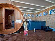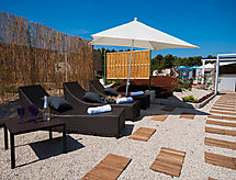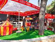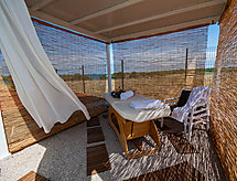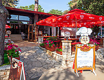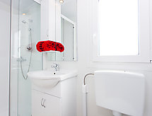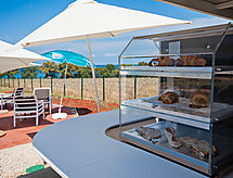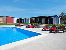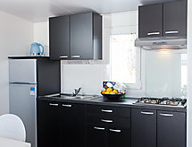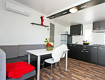 3 -sobna mobilna kućica 32 m2. Lijepo uređena: dnevni boravak/blagovaona s 1 kaučem za 2 osobe (140 cm, dužina 190 cm), TV-om sa sat. prijemnikom (plosnatim TV ekranom), klima uređajem. Izlaz na terasu. 1 soba s 1 franc. krevetom (160 cm, dužina 200 cm), tušem/WC-om. 1 soba s 2 kreveta (80 cm, dužina 200 cm). Otvorena kuhinja (4 plamena za kuhanje, zamrzivač). Tuš/WC. Terasa 18 m2 (natkrita). Garnitura za sjedenje, ležaljke (2). Na raspolaganju: visoka dječja stolica (uz doplatu). Internet (wireless LAN [WLAN], besplatan). Dodatna informacija: apartman za nepušače.- postrojenja