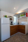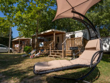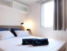 "Happy Premium Suite", 4 -sobna mobilna kućica 30 m2. Komforno uređena: dnevni boravak/blagovaona s el. grijanjem i klima uređajem. 1 soba s 1 franc. krevetom (140 cm, dužina 190 cm). 2 sobe, svaka soba s 2 kreveta (70 cm, dužina 190 cm). Otvorena kuhinja (4, mikrovalna pećnica, zamrzivač, el. aparat za kavu). Tuš/WC. Klima uređaj (uz doplatu). Terasa (djelomično natkrita). Garnitura za sjedenje, električni roštilj (prijenosni), ležaljke (2). Na raspolaganju: mrežice protiv komaraca. Parking (1 automobil) uz kuću. Dodatna informacija: apartman za nepušače. Najviše 1 mali kućni ljubimac / pas dozvoljen. Raspored kreveta je fleksibilan. Dostupno je više mogućnosti za spavanje od maksimalno dopuštenog broja osoba koji se ipak ne smije prekoračiti- postrojenja