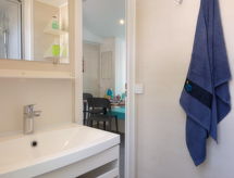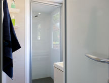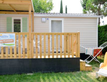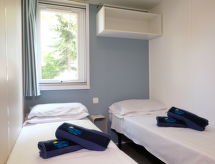 "Happy Premium", 4 -sobna mobilna kućica 30 m2. Komforno uređena: dnevni boravak/blagovaona s el. grijanjem i klima uređajem. 1 soba s 1 franc. krevetom (140 cm, dužina 190 cm). 2 sobe, svaka soba s 2 kreveta (70 cm, dužina 190 cm). Otvorena kuhinja (4 ploče za kuhanje, mikrovalna pećnica, zamrzivač, el. aparat za kavu). Tuš/WC. Klima uređaj (uz doplatu). Terasa 9 m2 (djelomično natkrita). Garnitura za sjedenje, električni roštilj (prijenosni), ležaljke (2). Na raspolaganju: mrežice protiv komaraca. Parking (1 automobil) uz kuću. Dodatna informacija: apartman za nepušače.- postrojenja