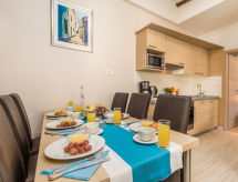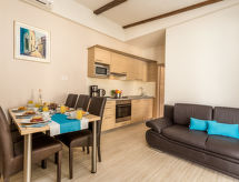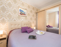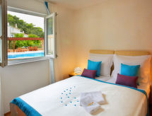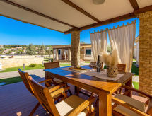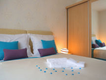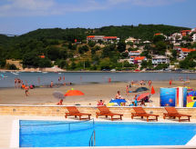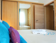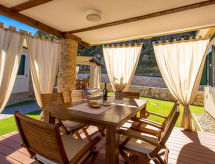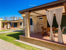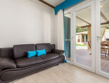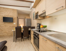 "Superior", 3 -sobna kuća 50 m2. Lijepo uređena: dnevni boravak/blagovaona s 1 kaučem za 2 osobe (160 cm, dužina 190 cm), TV-om sa sat. prijemnikom (plosnatim TV ekranom), klima uređajem. Izlaz na terasu. 2 sobe, svaka soba s 1 bračnim krevetom (2 x 80 cm, dužina 200 cm). Otvorena kuhinja (pećnica, perilica za suđe, 4 staklokeramičke ploče za kuhanje, mikrovalna pećnica, zamrzivač, el. aparat za kavu). 2 x tuš/WC. Terasa 20 m2 (natkrita). Garnitura za sjedenje. Na raspolaganju: Internet (wireless LAN [WLAN], besplatan).- postrojenja