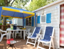 "Happy Standard", 3 -sobna mobilna kućica 25 m2. Svrsishodno uređena: dnevni boravak/blagovaona s el. grijanjem i klima uređajem. 1 soba s 1 franc. krevetom (140 cm, dužina 190 cm). 1 soba s 2 kreveta (70 cm, dužina 190 cm), 1 x 1 kreveta na kat (65 cm, dužina 179 cm). Otvorena kuhinja (4 ploče za kuhanje). Tuš/WC. Klima uređaj (uz doplatu). Terasa. Garnitura za sjedenje, električni roštilj (prijenosni), ležaljke (2). Na raspolaganju: mrežice protiv komaraca. Parking (1 automobil) uz kuću. Dodatna informacija: apartman za nepušače. Najviše 1 mali kućni ljubimac / pas dozvoljen.- postrojenja