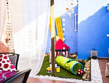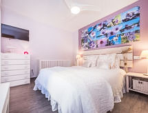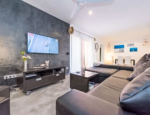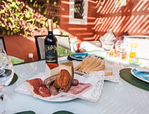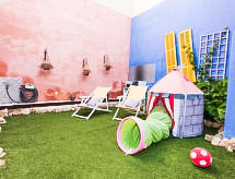 "Can Marc Beach House", 4 -sobna kuća 120 m2, u niskom prizemlju. Objekt pogodan za 6. Prostrano i svijetlo, potpuno renovirana, vrlo lijepo i udobno uređena: veliki dnevni boravak/blagovaona s kliznim vratima s otvorenim kaminom, stolom za blagovanje, TV-om, TV-om sa sat. prijemnikom, plosnatim TV ekranom, radiom, muzičkom linijom, DVD-om, klima uređajem, ventilatorom i grijanjem na topli zrak. Izlaz na terasu. 2 velike bračne sobe s panoramskim prozorom, svaka soba s 1 franc. krevetom (150 cm, dužina 200 cm), TV-om, plosnatim TV ekranom, klima uređajem, ventilatorom i grijanjem na topli zrak. 1 velika bračna soba s panoramskim prozorom s 1 franc. krevetom (150 cm, dužina 200 cm), kadom/tušem/WC-om, TV-om, plosnatim TV ekranom, klima uređajem, ventilatorom i grijanjem na topli zrak. Kuhinja (pećnica, perilica za suđe, 3 Indukcione ploče, toster, kuhalo za vodu, mikrovalna pećnica, zamrzivač, el. aparat za kavu, kuhinjski otok) s TV-om i plosnatim TV ekranom. Izlaz na mjesto za sjedenje u vrtu. Kada/tuš/bidet/WC. Velika vrtna terasa, sjenica. Garnitura za sjedenje, vrtni roštilj, lođa, ostava. Pogled na vrt. Na raspolaganju: perilica za rublje, glačalo, visoka dječja stolica, dječji krevetić, sušilo za kosu. Internet (wireless LAN [WLAN], besplatan). ETV5047- Aktivnosti u blizini