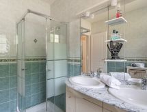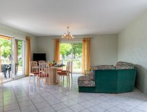 4 -sobna kuća u nizu 85 m2. Antikno uređena: dnevni boravak s TV-om (plosnatim TV ekranom). Izlaz u vrt. 1 soba s 1 franc. krevetom (1 x 140 cm, dužina 190 cm). 1 soba s 1 franc. krevetom (1 x 140 cm, dužina 190 cm). 1 soba s 1 krevetom (90 cm, dužina 190 cm), 1 franc. krevetom (1 x 140 cm, dužina 190 cm). Otvorena kuhinja (perilica za suđe, 3 plamena za kuhanje, toster, kuhalo za vodu, el. aparat za kavu, kombinirana mikrovalna pećnica). Tuš, odv. WC, duplim umivaonikom. Terasa 15 m2, prema jugu. Garnitura za sjedenje. Pogled na vrt. Na raspolaganju: perilica za rublje, sušilica, glačalo. Internet (wireless LAN [WLAN], uz doplatu). Parking (1 automobil). Dodatna informacija: apartman za nepušače. Protupožarni alarm.- postrojenja