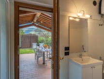 5 -sobna kuća 120 m2 na 2 etaže. Djelomično spušten strop, rustikalno i udobno uređena: dnevni boravak/blagovaona s otvorenim kaminom, stolom za blagovanje i TV-om sa sat. prijemnikom. Izlaz u vrt. Dnevno-spavaća soba s 1 kaučem za 2 osobe, otvorenim kaminom i TV-om sa sat. prijemnikom. Izlaz na terasu. Mala, otvorena kuhinja (perilica za suđe, 4 plamena za kuhanje, el. aparat za kavu). Tuš, odv. WC. Gornji kat: (kružne stepenice) dnevno-spavaća soba s 1 kaučem za 2 osobe. Izlaz na terasu. (kružne stepenice) 2 bračne sobe. 2 x tuš/bidet/WC. Grijanje na naftu. Prirodni kameni pod. Na raspolaganju: perilica za rublje, dječji krevetić do 2 godine. Parking (ograđen, 2 automobila) uz kuću. Dodatna informacija: kuća za nepušače. Zasebne stambene jedinice nisu interno povezane. Raspored kreveta je fleksibilan. Dostupno je više mogućnosti za spavanje od maksimalno dopuštenog broja osoba koji se ipak ne smije prekoračiti Na licu mjesta nema naplate dodatnih troškova, osim boravišne pristojbe.- postrojenja