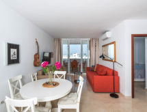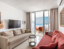"Carmen Vistamar", 3 -sobni apartman 73 m2 na 6. katu, prema jugozapadu. Objekt pogodan za 4 odraslih. Svijetlo, renoviran godine 2017, komforno i udobno uređen: dnevni boravak/blagovaona s digitalnim TV, međunarodnim TV kanalima, plosnatim TV ekranom, radiom, muzičkom linijom, klima uređajem i grijanjem na topli zrak. Izlaz na balkon. 1 soba s 1 krevetom (160 cm, dužina 200 cm), klima uređajem i grijanjem na topli zrak. 1 soba s 2 kreveta (90 cm, dužina 200 cm), klima uređajem i grijanjem na topli zrak. Otvorena kuhinja (pećnica, perilica za suđe, 4 Indukcione ploče, toster, kuhalo za vodu, zamrzivač, el. aparat za kavu) s stolom za blagovanje. Tuš/WC. Prirodni kameni pod. Terasa 8 m2. Garnitura za sjedenje. Prekrasan panoramski pogled na more i krajolik. Na raspolaganju: perilica za rublje, glačalo, visoka dječja stolica, dječji krevetić do 2 godine, sušilo za kosu. Internet (wireless LAN [WLAN], besplatan). VFT/MA/04780- postrojenja
