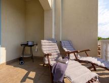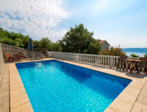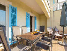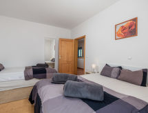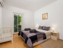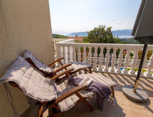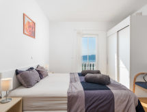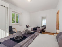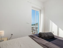"MOD136", 4 -sobna polovica dvojne kuće 120 m2 na 2 etaže. Dnevni boravak/blagovaona s TV-om sa sat. prijemnikom i klima uređajem. Izlaz na terasu. Otvorena kuhinja (pećnica, perilica za suđe, 4 staklokeramičke ploče za kuhanje, mikrovalna pećnica, zamrzivač, el. aparat za kavu). Gornji kat: 1 soba s 1 krevetom. 1 soba s 1 franc. krevetom. 1 soba s 1 krevetom i 1 franc. krevetom. Tuš/WC, kada/tuš/WC, duplim umivaonikom. Balkon 9 m2, terasa 19 m2. Garnitura za sjedenje, vrtni roštilj (prijenosni), ostava. Panoramski pogled na more i zaljev. Na raspolaganju: perilica za rublje, sauna, glačalo, visoka dječja stolica, dječji krevetić, sušilo za kosu, drvo (uz doplatu). Internet (wireless LAN [WLAN], besplatan). Parking (2 automobila). Dodatna informacija: kuća za nepušače. Najviše 1 mali kućni ljubimac / pas dozvoljen. Mačke nisu dozvoljene.- postrojenja