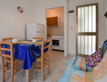 3 -sobni apartman 40 m2. Svijetlo, jednostavno i svrsishodno uređen: dnevni boravak/blagovaona s stolom za blagovanje i TV-om. 1 soba s 2 kreveta. 1 soba s 1 bračnim krevetom. Kuhinjska niša (4 ploče za kuhanje, pećnica, zamrzivač). Tuš/bidet/WC. Klima uređaj. 1 kućni ljubimac / pas dozvoljen.- postrojenja
