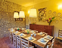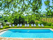 9 -sobna kuća 350 m2 na 2 etaže. Prostrano, renovirana, ukusno uređena: dnevni boravak s otvorenim kaminom. Otvorena blagovaona. Izlaz u vrt, na lođu. Otvoreni dnevni boravak s TV-om sa sat. prijemnikom. 1 soba s 2 kreveta. Izlaz na terasu. 1 bračna soba s tušem/WC-om. Kuhinja (5 pećnica, perilica za suđe, mikrovalna pećnica, zamrzivač, el. aparat za kavu). Izlaz u vrt, na mjesto za sjedenje u vrtu. Kada/WC, odv. WC. Gornji kat: 2 bračne sobe, svaka soba s tušem/WC-om. 1 soba s 2 kreveta. 1 bračna soba. Tuš/WC. Grijanje (uz doplatu). Prirodni kameni pod. 3 terase, vrtna terasa, sjenica. Garnitura za sjedenje, vrtni roštilj, ležaljke, lođa. Prekrasan panoramski pogled na krajolik. Na raspolaganju: perilica za rublje, glačalo, visoka dječja stolica, dječji krevetić. 1 kućni ljubimac / pas dozvoljen.- Značajke smještaja