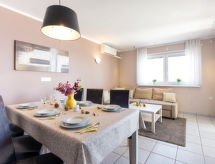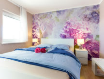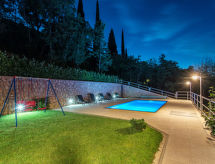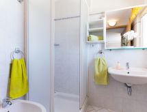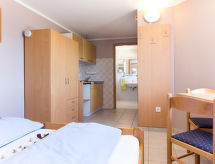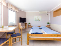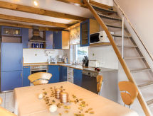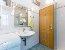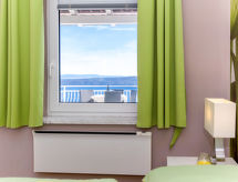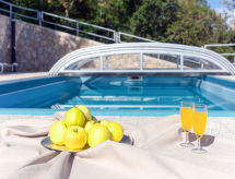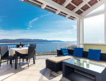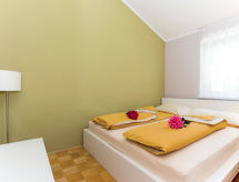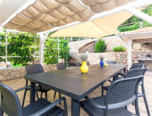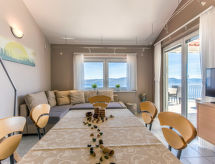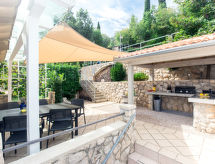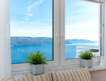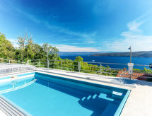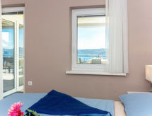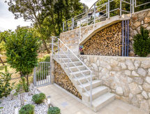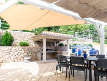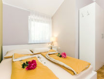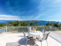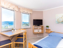 7 -sobna kuća 150 m2 na 3 etaže. Studio s 1 bračnim krevetom, stolom za blagovanje, TV-om sa sat. prijemnikom i klima uređajem. Izlaz na terasu. Otvorena kuhinja (2 ploče za kuhanje, toster, kuhalo za vodu, el. aparat za kavu). Tuš/WC. El. grijanje. Gornji kat: (vanjske stepenice) dnevni boravak/blagovaona s TV-om sa sat. prijemnikom i klima uređajem. Izlaz na terasu. 2 sobe, svaka soba s 1 franc. krevetom (160 cm, dužina 200 cm). Otvorena kuhinja (4 staklokeramičke ploče za kuhanje, toster, kuhalo za vodu, mikrovalna pećnica, zamrzivač, el. aparat za kavu). Tuš/WC, odv. WC. El. grijanje. 2. Gornji kat: (vanjske stepenice) dnevni boravak/blagovaona s švedskom peći, TV-om sa sat. prijemnikom i klima uređajem. Izlaz na terasu. 2 sobe, svaka soba s 1 franc. krevetom (160 cm, dužina 200 cm). Otvorena kuhinja (perilica za suđe, 4, mikrovalna pećnica, zamrzivač, el. aparat za kavu). Tuš/WC, odv. WC. El. grijanje, grijanje na drva. 3 terase (djelomično natkrite). Garnitura za sjedenje, ležaljke. Lijep panoramski pogled na more. Na raspolaganju: drvo (uz doplatu). Internet (wireless LAN [WLAN], besplatan). Dodatna informacija: kuća za nepušače.- postrojenja