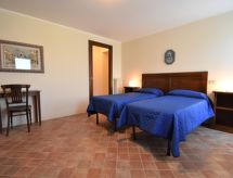 "La Corte Bricca (Casa Padronale)", 5 -sobna kuća 210 m2 na 3 etaže. Rustikalno i ukusno uređena: dnevni boravak s otvorenim kaminom i TV-om (plosnatim TV ekranom). Izlaz na terasu. Velika, otvorena kuhinja (pećnica, perilica za suđe, 4 plamena za kuhanje, toster, kuhalo za vodu, zamrzivač, el. aparat za kavu) s stolom za blagovanje. Izlaz na terasu. Odv. WC. Gornji kat: 1 soba s 2 kreveta. Izlaz na balkon. 1 soba s 1 franc. krevetom (160 cm). Izlaz na balkon. Kada/bidet/WC. 2. Gornji kat: s kosim stropom velika prolazna soba s 2 kreveta. 1 velika soba s kosim stropom s 1 franc. krevetom (160 cm). Tuš/bidet/WC. Grijanje na plin. Prirodni kameni pod. Balkon, velika terasa 150 m2. Garnitura za sjedenje, vrtni roštilj (prijenosni), ležaljke (4), ostava. Panoramski pogled na krajolik. Na raspolaganju: perilica za rublje, drvo (uz doplatu). Internet (wireless LAN [WLAN], besplatan). Garaža (2 automobili). Dodatna informacija: kuća za nepušače. CIR: 018036-CIM-00001- Značajke smještaja