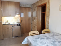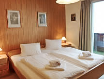 2 -sobni apartman 30 m2 na 3. katu, prema jugu. Svrsishodno uređen: dnevni boravak/blagovaona s TV-om sa sat. prijemnikom (plosnatim TV ekranom). Izlaz na balkon, prema jugu i prema zapadu. 1 soba s 1 bračnim krevetom (2 x 90 cm, dužina 200 cm). Izlaz na balkon, prema jugu i prema zapadu. Kuhinjska niša (2 ploče za kuhanje, toster, kuhalo za vodu, mikrovalna pećnica, el. aparat za kavu, raclette roštilj, set za fondue (sir)). Tuš/WC. Parketni pod. Balkon 8 m2, prema jugu i prema zapadu. Balkonski namještaj. Prekrasan pogled na planine i skijašku stazu. Na raspolaganju: sušilo za kosu. Internet (wireless LAN [WLAN], besplatan). Parking uz kuću. Dodatna informacija: apartman za nepušače. Vatrogasni aparat, nema dizala.- postrojenja