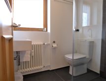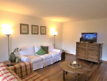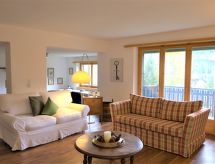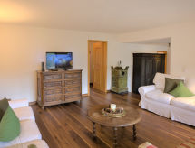 "Chesa Funtanella", 4 -sobni apartman 85 m2, u povišenom prizemlju. Prostrano, djelomično renoviran godine 2021, jednostavno i komforno uređen: otvoreni veliki dnevni boravak/blagovaona s stolom za blagovanje i TV-om (plosnatim TV ekranom). Izlaz na terasu. 1 velika bračna soba s 1 bračnim krevetom (1 x 180 cm, dužina 200 cm). Izlaz na balkon. 1 soba s 1 x 2 kreveta na kat (80 cm, dužina 190 cm). 1 dječja soba s 1 x 2 kreveta na kat (80 cm, dužina 190 cm). Mala kuhinja (pećnica, perilica za suđe, 4 Indukcione ploče, toster, kuhalo za vodu, el. aparat za kavu, Doze za mašinu za kavu (Nespresso) uz doplatu, raclette roštilj, kombinirana mikrovalna pećnica, set za fondue (chinoise)). Tuš/WC, tuš/bidet/WC. Grijanje. Parketni pod. Vrlo lijep pogled na planine i mjesto. Na raspolaganju: perilica za rublje, glačalo, sušilo za kosu. Internet (wireless LAN [WLAN], besplatan). Garaža na parceli (2 automobili), visina 195 cm, širina 240 cm. Dodatna informacija: prikladno za obitelji, nije prikladno za djecu mlađu od 3 godina. Nema dizala.- postrojenja