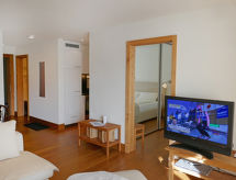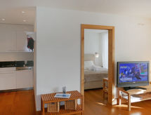 "Chesa San Bastiaun B5", 2 -sobni apartman 45 m2 na 1. katu. Ukusno i udobno uređen: otvoreni dnevni boravak/blagovaona s panoramskim prozorom s stolom za blagovanje i TV-om (plosnatim TV ekranom), DVD-om. Izlaz na balkon. 1 soba s panoramskim prozorom s 1 franc. krevetom (1 x 160 cm, dužina 200 cm). Mala, otvorena kuhinja (pećnica, perilica za suđe, 4 staklokeramičke ploče za kuhanje, toster, kuhalo za vodu, el. aparat za kavu, Doze za mašinu za kavu (Nespresso) uz doplatu, raclette roštilj). Kada/bidet/WC. Podno grijanje. Parketni pod. Balkonski namještaj. Vrlo lijep pogled na krajolik i rijeku. Na raspolaganju: sušilo za kosu. Internet (wireless LAN [WLAN], besplatan). Garaža br. B5 na parceli (1 automobil), visina 230 cm, širina 250 cm. Dodatna informacija: apartman za nepušače, kuća za nepušače.- postrojenja