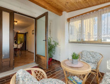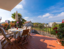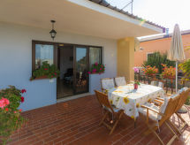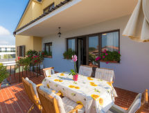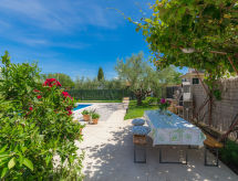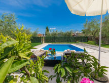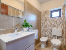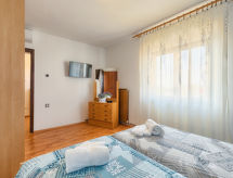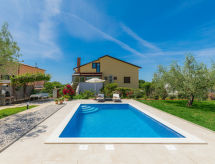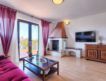 3 -sobna kuća 108 m2 na 1. katu. Dnevni boravak/blagovaona 33 m2 s 1 kaučem za 2 osobe (160 cm, dužina 190 cm), TV-om sa sat. prijemnikom (plosnatim TV ekranom), klima uređajem. Izlaz na terasu. 1 soba s 1 bračnim krevetom (2 x 90 cm, dužina 200 cm). 1 soba s 2 kreveta (90 cm, dužina 200 cm). Otvorena kuhinja (pećnica, perilica za suđe, 4 plamena za kuhanje, kuhalo za vodu, zamrzivač, el. aparat za kavu). Tuš/bidet/WC, odv. WC. Grijanje (uz doplatu). Terasa 8 m2 (natkrita), terasa 15 m2. Garnitura za sjedenje, ležaljke. Pogled na bazen i vrt. Na raspolaganju: glačalo, dječji krevetić, sušilo za kosu. Internet (wireless LAN [WLAN], besplatan). Dodatna informacija: kuća za nepušače.- postrojenja