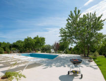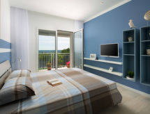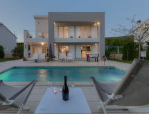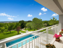 5 -sobna vila 200 m2 na 2 etaže. Dnevni boravak/blagovaona s TV-om sa sat. prijemnikom (plosnatim TV ekranom), klima uređajem. Izlaz na terasu. 1 soba s 2 kreveta (80 cm, dužina 190 cm). Otvorena kuhinja (pećnica, perilica za suđe, 4 staklokeramičke ploče za kuhanje, mikrovalna pećnica, zamrzivač, el. aparat za kavu). Tuš/WC. Gornji kat: 1 soba s 1 kaučem za 1 osobu (90 cm, dužina 190 cm), 1 franc. krevetom (160 cm, dužina 200 cm), tušem/bidetom/WC-om i TV-om sa sat. prijemnikom (plosnatim TV ekranom), klima uređajem. Izlaz na terasu. 1 soba s 1 bračnim krevetom (2 x 80 cm, dužina 190 cm), klima uređajem. Izlaz na terasu. 1 soba s 1 bračnim krevetom (2 x 80 cm, dužina 190 cm), tušem/bidetom/WC-om i klima uređajem. Izlaz na terasu. Kada/bidet/WC. Terasa 30 m2 (natkrita), terasa 30 m2 (djelomično natkrita). Garnitura za sjedenje, vrtni roštilj (prijenosni), ležaljke. Prekrasan panoramski pogled na more i krajolik. Na raspolaganju: sef, dječji krevetić, sušilo za kosu. Internet (wireless LAN [WLAN], besplatan). 1 mali kućni ljubimac / pas dozvoljen.- Značajke smještaja