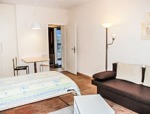 1 -sobni apartman u potkrovlju 40 m2 na 3. katu. Svijetlo, komforno i udobno uređen: veliki dnevni boravak/blagovaona s 2 rasklopna ormar-kreveta za 1 osobu (90 cm, dužina 200 cm), stolom za blagovanje, kabelskom TV, plosnatim TV ekranom, CD-om, muzičkom linijom i DVD-om. Izlaz na terasu. Kuhinja (3 ploče za kuhanje, pećnica). Kada/WC. Grijanje. Velika terasa 17 m2 (djelomično natkrita), prema jugozapadu. Garnitura za sjedenje, ležaljke (1). Lijep pogled na planine, krajolik i mjesto. Na raspolaganju: Internet (wireless LAN [WLAN]). IPod docking station. Dodatna informacija: apartman za nepušače.- postrojenja