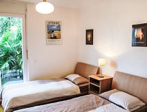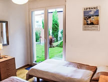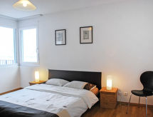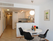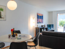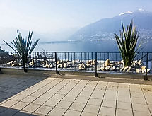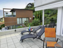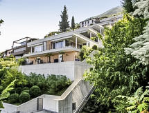 3 -sobni apartman 100 m2 na 3. katu. Komforno i moderno uređen: otvoreni veliki dnevni boravak/blagovaona s TV-om sa sat. prijemnikom, plosnatim TV ekranom, muzičkom linijom i DVD-om. Izlaz na terasu. 1 bračna soba s 1 franc. krevetom (160 cm). Izlaz na terasu. 1 soba s 2 kreveta (90 cm, dužina 200 cm). Izlaz na terasu. Otvorena kuhinja (pećnica, perilica za suđe, 4 staklokeramičke ploče za kuhanje, toster, kuhalo za vodu, mikrovalna pećnica, zamrzivač, el. aparat za kavu, Doze za mašinu za kavu (Nespresso) uz doplatu) s stolom za blagovanje. Kada/WC, tuš/WC. Klima uređaj. Terasa 40 m2, vrtna terasa 20 m2. Garnitura za sjedenje, ležaljke (2). Prekrasan panoramski pogled na jezero, planine i krajolik. Na raspolaganju: perilica za rublje, sušilica, glačalo, sušilo za kosu. Internet (wireless LAN [WLAN], besplatan). Blu-ray player. Garaža br. 6, visina 200 cm, širina 400 cm. Dodatna informacija: nije prikladno za malu djecu. Apartman za nepušače.- Značajke smještaja