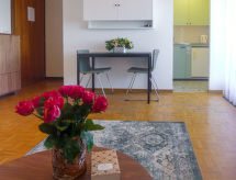 1 -sobni apartman 25 m2 na 3. katu. Dnevni boravak s 2 rasklopna zidna kreveta za 1 osobu (90 cm, dužina 190 cm), kabelskom TV (plosnatim TV ekranom), radiom i CD-om. Mala kuhinja (2 ploče za kuhanje, toster, kuhalo za vodu, el. aparat za kavu, set za fondue (chinoise, sir)). Tuš/WC. Balkon 7 m2, prema jugu i prema zapadu. Balkonski namještaj. Vrlo lijep pogled na planine, dolinu i mjesto. Na raspolaganju: glačalo, sušilo za kosu. Internet (wireless LAN [WLAN], besplatan). Dodatna informacija: apartman za nepušače. 1 kućni ljubimac / pas dozvoljen. No oven.- Značajke smještaja