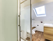 2 -sobni apartman u potkrovlju 45 m2 na 3. katu. Svijetlo, potpuno renoviran godine 2017, lijepo i moderno uređen: dnevni boravak/blagovaona s 1 kaučem za 2 osobe (140 cm, dužina 190 cm), TV-om (plosnatim TV ekranom). 1 soba s 1 franc. krevetom (140 cm, dužina 190 cm). Otvorena kuhinja (pećnica, perilica za suđe, 2 Indukcione ploče, mikrovalna pećnica). Tuš/WC. Parketni pod. Lijep pogled u daljini na more. Na raspolaganju: perilica za rublje, glačalo, sušilo za kosu. Internet (wireless LAN [WLAN], besplatan). Parking br. 11. Dodatna informacija: apartman za nepušače. 1 kućni ljubimac / pas dozvoljen. Protupožarni alarm. 64122172252SJ- Značajke smještaja