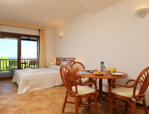 "Dalia 14 - Vista Village", 1 -sobna kuća u nizu 35 m2, u prizemlju. Komforno i udobno uređena: dnevni boravak/blagovaona s 1 bračnim krevetom, TV-om, TV-om sa sat. prijemnikom i plosnatim TV ekranom. Izlaz na terasu. Kuhinjska niša (4 ploče za kuhanje) s stolom za blagovanje. Tuš/bidet/WC. Klima uređaj (uz doplatu). Mala terasa (natkrita). Garnitura za sjedenje. Lijep pogled na more. Na raspolaganju: sef, sušilo za kosu. Parking br. D14 (natkrit, ograđen), širina 230 cm. IUN:E2088- Značajke smještaja