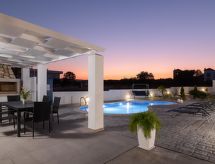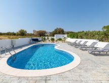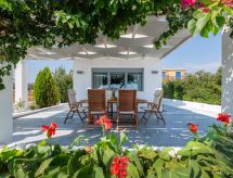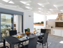 "Dama Dama", 6 -sobna vila 184 m2 na 2 etaže. Prostrano i svijetlo, komforno i lijepo uređena: otvorena dnevno-spavaća soba s 2 kauča za 1 osobu, stolom za blagovanje i TV-om sa sat. prijemnikom (plosnatim TV ekranom). Izlaz u vrt, na bazen. Otvorena dnevno-spavaća soba s 2 kauča za 1 osobu, stolom za blagovanje i TV-om sa sat. prijemnikom (plosnatim TV ekranom). Izlaz u vrt, na bazen. Otvorena kuhinja (pećnica, 4 staklokeramičke ploče za kuhanje, toster, kuhalo za vodu, mikrovalna pećnica, el. aparat za kavu) s malim stolom za blagovanje. 2 x tuš/WC. Klima uređaj. Gornji kat: (stepenice bez rukohvata) 2 bračne sobe, svaka soba s 1 bračnim krevetom. Izlaz na balkon. 1 bračna soba s 2 kreveta. Izlaz na balkon. 1 bračna soba s 2 kreveta. 2 x tuš/WC. Klima uređaj. 2 velika balkona, 2 velike terase (djelomično natkrite). Vrtni roštilj. Lijep pogled na more, bazen i vrt. Na raspolaganju: perilica za rublje, glačalo, sušilo za kosu. Internet (wireless LAN [WLAN], besplatan). Dodatna informacija: jedna bračna soba se nalazi izvan apartmana. Kuća za nepušače. 00001387604- postrojenja