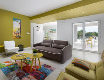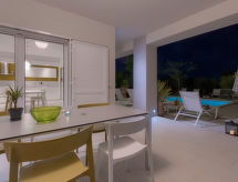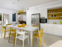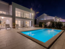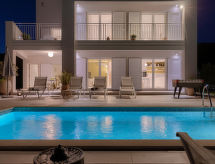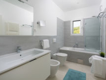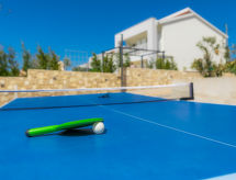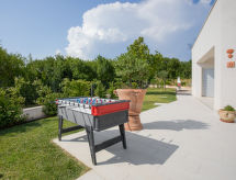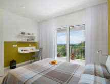 5 -sobna vila 200 m2 na 2 etaže. Dnevni boravak/blagovaona s TV-om sa sat. prijemnikom (plosnatim TV ekranom), klima uređajem. Izlaz na terasu. 1 soba s 2 kreveta (80 cm, dužina 190 cm). Otvorena kuhinja (pećnica, perilica za suđe, 4 staklokeramičke ploče za kuhanje, mikrovalna pećnica, zamrzivač, el. aparat za kavu). Tuš/WC. Gornji kat: 1 soba s 1 kaučem za 1 osobu (90 cm, dužina 190 cm), 1 franc. krevetom (160 cm, dužina 200 cm), tušem/bidetom/WC-om i TV-om sa sat. prijemnikom (plosnatim TV ekranom), klima uređajem. Izlaz na terasu. 1 soba s 1 bračnim krevetom (2 x 80 cm, dužina 190 cm), klima uređajem. Izlaz na terasu. 1 soba s 1 bračnim krevetom (2 x 80 cm, dužina 190 cm), tušem/bidetom/WC-om i klima uređajem. Izlaz na terasu. Kada/bidet/WC. Terasa 30 m2 (natkrita), terasa 30 m2 (djelomično natkrita). Garnitura za sjedenje, vrtni roštilj (prijenosni), ležaljke. Prekrasan panoramski pogled na more i krajolik. Na raspolaganju: sef, dječji krevetić, sušilo za kosu. Internet (wireless LAN [WLAN], besplatan). 1 mali kućni ljubimac / pas dozvoljen.- Značajke smještaja