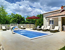 4 -sobna vila 195 m2 na 2 etaže. Dnevni boravak/blagovaona s TV-om sa sat. prijemnikom (plosnatim TV ekranom), muzičkom linijom i klima uređajem. Izlaz na terasu, na bazen. 1 soba s 1 franc. krevetom (160 cm, dužina 210 cm), kadom/bidetom/WC-om, TV-om sa sat. prijemnikom i klima uređajem. Otvorena kuhinja (pećnica, perilica za suđe, 4 staklokeramičke ploče za kuhanje, mikrovalna pećnica, zamrzivač, el. aparat za kavu). Odv. WC. Gornji kat: 2 sobe, svaka soba s 1 franc. krevetom (160 cm, dužina 210 cm), kadom/bidetom/WC-om, TV-om sa sat. prijemnikom i klima uređajem. Izlaz na terasu. 1 soba s tušem i hidromasažna kada. Terasa 30 m2 (djelomično natkrita), 2 terase 6 m2. Garnitura za sjedenje, ležaljke. Pogled na bazen i krajolik. Na raspolaganju: sef, dječji krevetić (uz doplatu), sušilo za kosu. Internet (wireless LAN [WLAN], besplatan). 1 mali kućni ljubimac / pas dozvoljen.- Značajke smještaja