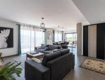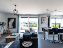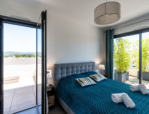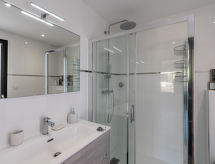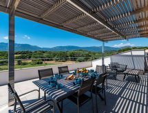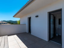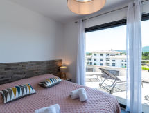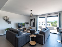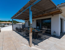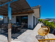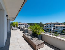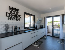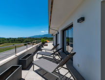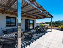 5 -sobni apartman 137 m2 na 3. katu. Vrlo lijepo i moderno uređen: dnevni boravak/blagovaona s TV-om (plosnatim TV ekranom). Izlaz na terasu. 1 soba s 1 franc. krevetom (160 cm, dužina 200 cm), tušem. Izlaz na terasu. 1 soba s 1 franc. krevetom (160 cm, dužina 200 cm), tušem/WC-om. Izlaz na terasu. 1 soba s 2 kreveta (90 cm, dužina 190 cm). 1 soba s 2 kreveta (90 cm, dužina 200 cm). Otvorena kuhinja (pećnica, perilica za suđe, 3 Indukcione ploče, toster, kuhalo za vodu, mikrovalna pećnica, zamrzivač, el. aparat za kavu, Doze za mašinu za kavu (Tassimo)). Izlaz na terasu. Tuš, odv. WC. Klima uređaj. Velika terasa 120 m2. Ležaljke (2). Lijep pogled na planine. Na raspolaganju: perilica za rublje, sušilica, glačalo. Internet (wireless LAN [WLAN], besplatan). Parking br. 731 uz kuću. Dodatna informacija: apartman za nepušače. Protupožarni alarm.- Značajke smještaja