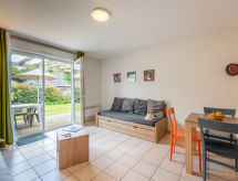 "Cottage Confort 3 Pers.", 1 -sobna kuća u nizu 29 m2. Svrsishodno uređena: dnevno-spavaća soba s 1 kaučem za 1 osobu (80 cm, dužina 190 cm), 1 kaučem za 2 osobe (140 cm, dužina 190 cm), stolom za blagovanje i TV-om. Izlaz na terasu. Kuhinjska niša (2 ploče za kuhanje, toster, mikrovalna pećnica, el. aparat za kavu). Kada, odv. WC. El. grijanje. Terasa. Garnitura za sjedenje. Na raspolaganju: visoka dječja stolica, dječji krevetić (uz doplatu). Internet (wireless LAN [WLAN], uz doplatu). Dodatna informacija: 2 kućna ljubimca / psa dozvoljena. Protupožarni alarm.- postrojenja