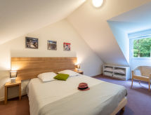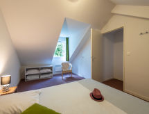 "Cottage Confort 4 Pers.", 2 -sobna kuća u nizu 39 m2 na 2 etaže. Svrsishodno uređena: dnevni boravak s 1 krevetom na izvlačenje (2 osobe 2 x 80 cm, dužina 190 cm), kutom za blagovanje i TV-om. Izlaz na terasu. Kuhinjska niša (perilica za suđe, 4 staklokeramičke ploče za kuhanje, toster, mikrovalna pećnica, zamrzivač, el. aparat za kavu). Kada, odv. WC. El. grijanje. Gornji kat: 1 soba s 1 bračnim krevetom (2 x 80 cm, dužina 200 cm). Terasa 10 m2. Garnitura za sjedenje. Pogled na golf igralište. Na raspolaganju: visoka dječja stolica, dječji krevetić (uz doplatu). Internet (wireless LAN [WLAN], uz doplatu). Dodatna informacija: 2 kućna ljubimca / psa dozvoljena. Protupožarni alarm.- postrojenja