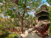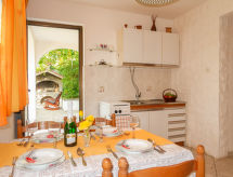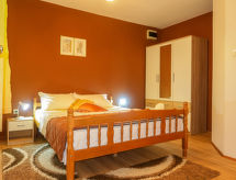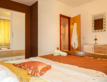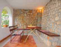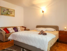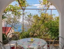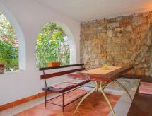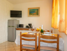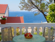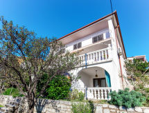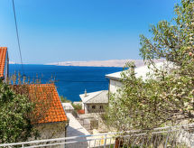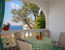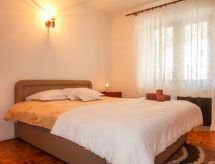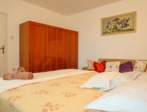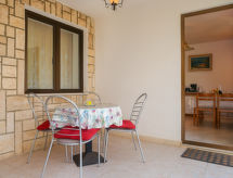2 -sobni apartman 50 m2, u povišenom prizemlju. Predsoblje s klima uređajem. 1 soba s 1 franc. krevetom (180 cm, dužina 200 cm), tušem/WC-om. 1 soba s 1 kaučem za 1 osobu (120 cm, dužina 200 cm), 1 franc. krevetom (160 cm, dužina 200 cm). Izlaz na terasu. Kuhinja/dn. boravak (2 ploče za kuhanje, toster, kuhalo za vodu, mikrovalna pećnica, zamrzivač, el. aparat za kavu) s stolom za blagovanje, TV-om sa sat. prijemnikom. Izlaz na terasu. Tuš/WC. Klima uređaj (uz doplatu). 3 terase (natkrite). Garnitura za sjedenje, ležaljke (2). Pogled na more. Na raspolaganju: Internet (wireless LAN [WLAN], besplatan). Dodatna informacija: kuća za nepušače. Najviše 1 kućni ljubimac / pas dozvoljen.- postrojenja