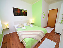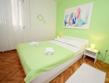 3 -sobni apartman 60 m2 na 1. katu, prema jugu. Dnevni boravak/blagovaona s 1 kaučem za 1 osobu (140 cm, dužina 200 cm), TV-om sa sat. prijemnikom (plosnatim TV ekranom), klima uređajem. Izlaz na terasu. 1 soba s 1 bračnim krevetom (2 x 80 cm, dužina 200 cm), tušem/WC-om. 1 soba s 1 franc. krevetom (140 cm, dužina 200 cm). Otvorena kuhinja (pećnica, 2 staklokeramičke ploče za kuhanje, kuhalo za vodu, mikrovalna pećnica, zamrzivač, el. aparat za kavu). Kada/WC s kutnom kadom. Terasa 12 m2 (natkrita). Garnitura za sjedenje. Djelomičan pogled u daljini na more i mjesto. Na raspolaganju: perilica za rublje, dječji krevetić. Internet (wireless LAN [WLAN], besplatan). Parking (ograđen). 1 kućni ljubimac / pas dozvoljen.- Značajke smještaja