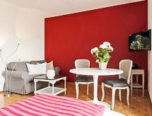 "Double Room", 1 -sobni apartman 35 m2 na 3. katu, prema jugu. Svrsishodno uređen: dnevni boravak/blagovaona s 2 rasklopna ormar-kreveta za 1 osobu, TV-om sa sat. prijemnikom i radiom. Kuhinja (4 ploče za kuhanje, pećnica, perilica za suđe, el. aparat za kavu, Doze za mašinu za kavu (Nespresso) uz doplatu). Kada/WC. Balkon. Garnitura za sjedenje. Na raspolaganju: Internet (wireless LAN [WLAN], besplatan). Dodatna informacija: apartman za nepušače. Najviše 1 kućni ljubimac / pas dozvoljen.- postrojenja