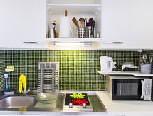 1 -sobni studio 24 m2 na 4. katu. Svijetlo, lijepo uređen: dnevni boravak/blagovaona s 1 rasklopnim franc. zidnim krevetom za 2 osobe (140 cm, dužina 200 cm), TV-om (plosnatim TV ekranom). Izlaz na balkon, prema zapadu. Kuhinjska niša (2 staklokeramičke ploče za kuhanje, mikrovalna pećnica, zamrzivač). Tuš/WC. Balkon 6 m2, prema zapadu. Balkonski namještaj. Prekrasan pogled na more, planine, bazen i more. Na raspolaganju: perilica za rublje, glačalo, sušilo za kosu. Internet (wireless LAN [WLAN], besplatan). Dodatna informacija: apartman za nepušače. 1 kućni ljubimac / pas dozvoljen. Protupožarni alarm. 64122182590PA- Značajke smještaja