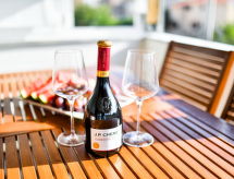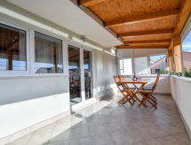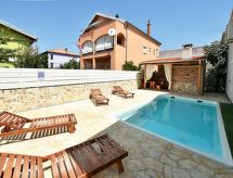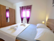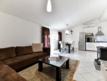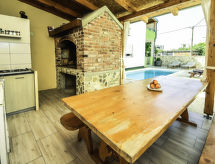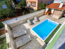 6 -sobna kuća 120 m2 na 2 etaže, prema jugozapadu. Dnevni boravak/blagovaona 40 m2 s TV-om sa sat. prijemnikom (plosnatim TV ekranom), klima uređajem. Izlaz na terasu. 2 sobe, svaka soba s 1 franc. krevetom (160 cm, dužina 200 cm). Otvorena kuhinja (4 ploče za kuhanje, perilica za suđe, mikrovalna pećnica, zamrzivač). Kada/bidet/WC, odv. WC. Potkrovlje (vanjske stepenice) dnevni boravak/blagovaona 36 m2 s TV-om sa sat. prijemnikom (plosnatim TV ekranom), klima uređajem. Izlaz na terasu. 1 soba s 1 franc. krevetom (160 cm, dužina 200 cm). 1 soba s 1 franc. krevetom (180 cm, dužina 200 cm). Otvorena kuhinja (4 ploče za kuhanje, pećnica, perilica za suđe, mikrovalna pećnica, zamrzivač). Kada/WC, odv. WC. Terasa 10 m2 (natkrita), terasa 14 m2 (natkrita). Garnitura za sjedenje, ležaljke. Pogled na bazen. Na raspolaganju: Internet (wireless LAN [WLAN], besplatan).- postrojenja