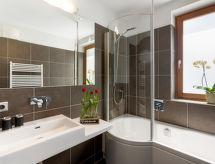 "Top 10/9", 3 -sobni apartman 75 m2. Svijetlo, ukusno i udobno uređen: 2 bračne sobe. Dnevno-spavaća soba s 1 kaučem za 2 osobe, stolom za blagovanje, TV-om sa sat. prijemnikom i plosnatim TV ekranom. Soba za prtljagu. Otvorena kuhinja (pećnica, perilica za suđe, 4 staklokeramičke ploče za kuhanje, toster, kuhalo za vodu, mikrovalna pećnica, zamrzivač, el. aparat za kavu). Kada, kada/bidet/WC, odv. WC. Podno grijanje. Terasa. Garnitura za sjedenje. Vrlo lijep panoramski pogled na planine. Na raspolaganju: sušilo za kosu. Internet (wireless LAN [WLAN], besplatan). Dodatna informacija: apartman za nepušače. 1 kućni ljubimac / pas dozvoljen. Protupožarni alarm, vatrogasni aparat. Rezervira se tipski objekt (kuća, apartman) i moguća su manja odstupanja. 50616-001123-2020- postrojenja