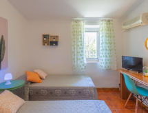 4 -sobna kuća 100 m2 na 1. katu. Komforno uređena: predsoblje. Izlaz na terasu. Dnevni boravak s otvorenim kaminom i TV-om. 2 bračne sobe, svaka soba s TV-om i klima uređajem. 1 soba s 2 kreveta, TV-om i klima uređajem. Kuhinja (pećnica, 4 Indukcione ploče, kuhalo za vodu, zamrzivač, el. aparat za kavu) s stolom za blagovanje, TV-om i klima uređajem. Tuš/bidet/WC. Klima uređaj, grijanje toplim zrakom (uz doplatu), bojlerom (50 litara). Terasa 20 m2, veliki vrt. Garnitura za sjedenje, ležaljke. Lijep panoramski pogled na krajolik. Na raspolaganju: perilica za rublje, mrežice protiv komaraca, sušilo za kosu. Internet (wireless LAN [WLAN], besplatan). Parking (ograđen) uz kuću. Dodatna informacija: 2 kućna ljubimca / psa dozvoljena. Vlastiti ulaz. Na licu mjesta nema naplate dodatnih troškova.- postrojenja